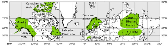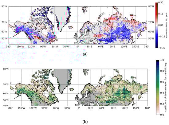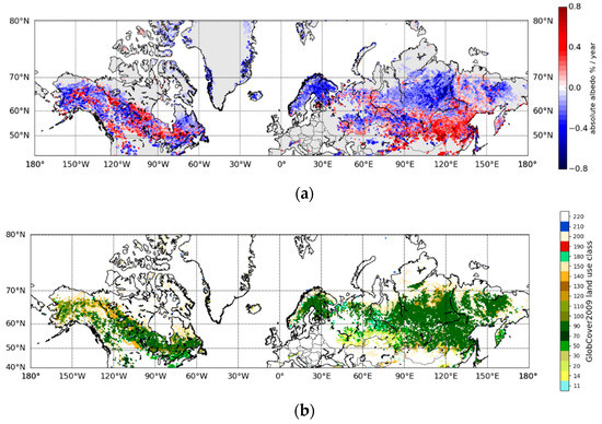 Climate change over the Northern Hemisphere high latitudes and boreal forest zone has affected the snow and vegetation cover and, thus, the surface albedo [1,2,3,4,5,6,7,8,9,10,11,12]. Previous studies have shown that the duration and timing of the snow melt season has changed differently in different areas [13,14,15,16,17]. The snow cover extent has decreased especially significantly in the spring [3,5,7], and the surface albedo during the melt season months has also decreased, largely due to a decline in the area covered by snow [10]. These changes affect the local and global energy budgets [6]. The changing climate also changes the vegetation. The increased size of vegetation decreases wintertime albedo by covering the land surface and casting larger shadows on snow-covered surfaces. This is particularly relevant in the late winter. Changes in vegetation affect the local climate and the scattering properties of the forest (with larger shadows and increased multiple scattering due to increased forest height or density) [11]. The changes in the vegetation are also linked to changes in the spatial coverage of permafrost.