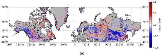 The inconsistency in the effects of vegetation on winter time albedo can be partly explained by the different response of vegetation to the changing climate. According to Xu et al. [26], in Eurasia the normalized difference vegetation index (NDVI) is positively correlated with warming temperature, whereas in North America the effect varies in different regions and patterns of greening and browning in North America are fragmented [26]. It is noteworthy that while the NDVI data describe growing season conditions and are thus not directly translatable to winter conditions, they should be considered an indicator of changes that may also be visible in winter, such as growth in shrub size and coverage. The observed changes in vegetation cannot be directly translated to changes in surface albedo. According to Myers-Smith et al. [56] shrub growth is responsive to different drivers in different regions. Sturm et al. [50] found that if shrubs protrude above the snow and cover 10% of the surface, the albedo will decrease by 30%. The spatial coverage of continuous permafrost shows similar spatial patterns with many of the trends for the melt season parameters. For example, at the southern edge of Central Siberian Plain and in Labrador Peninsula continuous permafrost ends in the same area as the trends for melt season change. The difference in trends for melt season parameters can be due to changes in permafrost coverage causing changes in land use, such as vegetation or formation of melt ponds, or by different response of vegetation and snow cover to climatic changes in areas with and without permafrost.