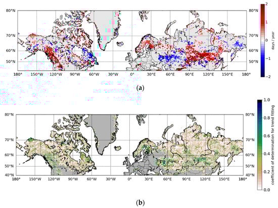 (a) The rates of change for the end date of melt between 1982 and 2015 using 5-year rolling mean (showing cases for which R2 of the fit was larger than 0.5). The negative rates of change mean earlier end of melt and the positive rates of change mean later dates of end of melt. (b) The coefficient of determination (R2) values for the trend fitting for end day of melt.