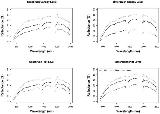 The mean, minimum and maximum reflectance spectra of sagebrush and bitterbrush at canopy level and 10 × 10 m plots of two species.