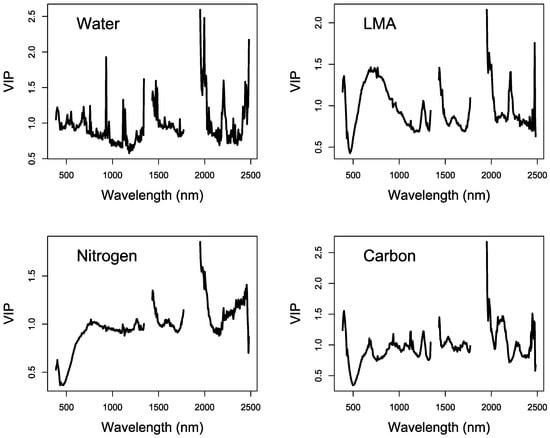 Mean variable importance in projection (VIP) values of the canopy-level PLSR calibration models in sagebrush.