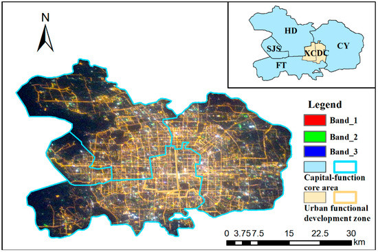 The International Space Station photography of six central districts in Beijing, was acquired during the space station passing over China on 19 April 2011, 18:23 UTC (20 April 2011, 2:23 local time) by 12.1-megapixel Nikon D3S digital still camera. ISS photography is available in NASA’s “Gateway to Astronaut Photography of Earth” database (https://eol.jsc.nasa.gov/SearchPhotos/). It was proved that ISS photography can distinguish major lighting types and changes based on its scotopic and photopic bands [40]. Due to the lack of geo-reference, ISS photography needs to be attached to accurate and reliable geospatial information. In order to produce spatially-adjusted ISS images, feature-based image registration with a third-order polynomial fit was employed by clearly matching road intersections of images to Google Earth.