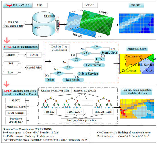 This proposed method was divided into three main steps: HSL transformation and saturation calibration of ISS photography, generation of urban functional zones based on point-of-interest, and population spatialization based on the Random Forest Regression. In order to clearly explain these processes, detail of this method was provided in Figure 2.