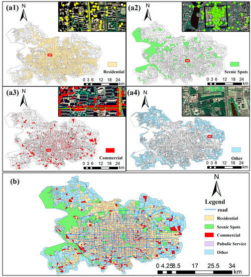 Results of urban functional zones in terms of different types including residential areas (a1), scenic spots (a2), commercial areas (a3) and “others” (a4), and their zoom-in images of POI in typical places. (b) Represents the complete result of urban functional zones in the selected study area.