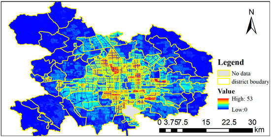 Despite the fact that applications of LULC was proved by previous research in large-scale studies [31,32,33], this paper suggested that urban functions worked as better indicators than land cover for high-resolution population mapping. Instead of distinguishing different population-sensitivity, LULC took various urban functions as ‘impervious surface’, comprising one homogeneous class. Taking residential areas and commercial services as examples, although they both belong to ISA in term of LULC, they made different contribution to population disaggregation. Especially in well-urbanized metropolises, when scaling down to a small level, ignoring these differences would bring great bias to the result of population spatialization.