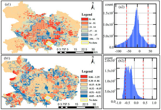 To further explain the contribution of these potential features, in the group (b) of Figure 8, there were scatterplots between them and population. By combining the feature importance of all four situations, the stacked plot (b1) reported the quantity and changes of these candidate features. The high correlation (R2 = 0.7, p < 0.01) between population and NTL of the residential function quantitatively explained the reason why this feature accounted for the greatest contribution in the RF model. In the same manner, the contribution of residential, commercial areas, and urban height corresponded with their correlation with population. Due to higher population-sensitivity (0.38 vs. 0.21), height made more contribution to population spatialization than the function of commercial services. Although scenic spots and “others” should be recognized as noise in terms of the low correlation, the aforementioned experiment has already proved its improvement for population distribution. This contradictory information could be explained by the black-box of the RF model, a smart deep learning algorithm. In addition, the improvement of population-sensitivity by dividing the study area as two relatively homogeneous parts demonstrated the feature importance of type.