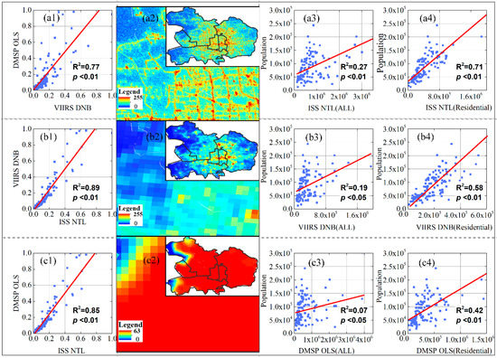 The comparison of ISS NTL and previous generations of nighttime light images in terms of resolution, and sensitivity to population. Scatterplots of VIIRS DNB and DMSP OLS (a1), ISS NTL and VIIRS DNB (b1) and ISS NTL and DMSP/OLS (c1). (a2,b2,c2) represent ISS NTL, DMSP OLS and VIIRS DNB and their zoom-in images respectively. (a3,b3,c3) show scatterplots of population and NTL while (a4,b4,c4) represent scatter diagrams of population and NTL covered by the residential function.