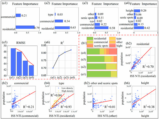 The group of (a) shows different feature candidates in the Random Forest regression (a1–a4) and their accuracy assessments (RMSE in a5, R2 as correlation with validation data in a6). The group of (b) explains reasons of features importance by scatterplots between selected features and population. (b1) shows stacked bars of features importance in all step-wise situations.