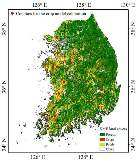 Korea Ministry of Environment (KME) land cover map of South Korea with 5 m spatial resolution (http://www.me.go.kr/eng/web/main.do). The red circles indicate counties with more than 5000 ha of paddy areas, according to data obtained from the Korean Statistical Information Service (KOSIS) for the calibration of the crop model.