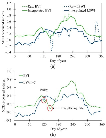 Seasonal variations in enhanced vegetation index (EVI) and land surface water index (LSWI) derived from Moderate Resolution Imaging Spectroradiometer (MODIS) imagery at a paddy field in South Korea: (a) comparisons between raw and interpolated indices (EVI and LSWI) and (b) conditions for the detection of paddy fields and transplanting date. T is the threshold value of the LSWI.