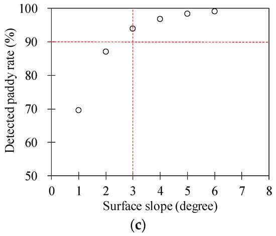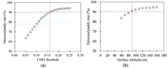 Determination of the thresholds as functions of (a) land surface water index (LSWI), (b) surface altitude, and (c) surface slope used to detect paddy fields. The red dotted lines show the determined threshold values when the detected paddy rates exceed 90% while increasing the threshold values at regular intervals.