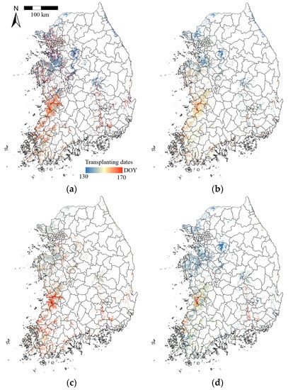 Detected spatial distributions of transplanting dates (day of year, DOY) for paddy fields derived from Moderate Resolution Imaging Spectroradiometer (MODIS) images in South Korea in (a) 2011, (b) 2012, (c) 2013, and (d) 2014.