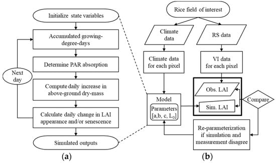 Schematic diagrams of (a) the daily crop growth simulation process of the GRAMI model and (b) the integrated crop modeling system used to project spatiotemporal crop productions based on the model and remote sensing (RS) data. (LAI: leaf area index, PAR: photosynthetic active radiation, and VI: vegetation index).
