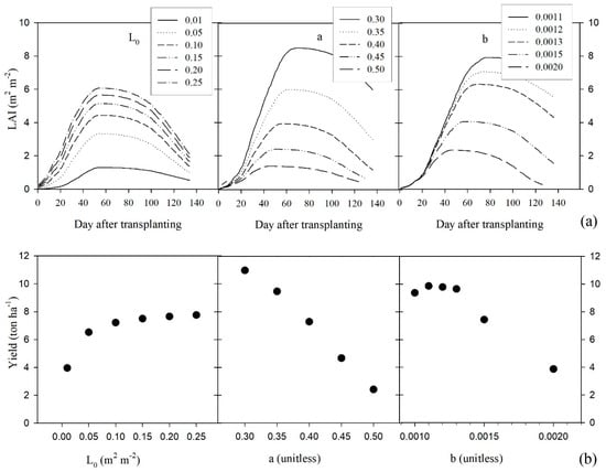 GRAMI model sensitivities: responses of Leaf Area Index, LAI (a) and yield (b) to three parameters to control leaf growth and development, i.e., initial LAI (L0), a, and b.
