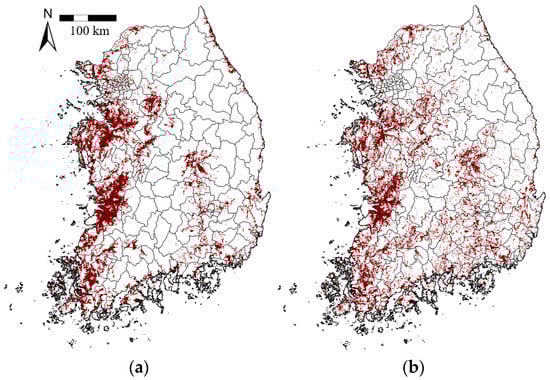 Comparison of spatial distributions of paddy fields between (a) the Moderate Resolution Imaging Spectroradiometer (MODIS) imagery-based detection map in 2013 and (b) the Korea Ministry of Environment (KME) land cover classification map in South Korea.