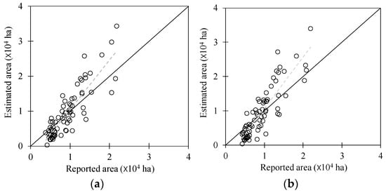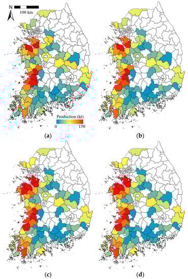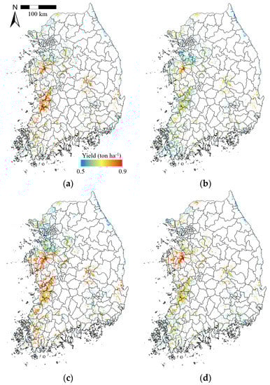 Paddy fields and transplanting dates of rice were estimated by using the approach proposed by Xiao et al. [] prior to simulation of the rice yield and production using the GRAMI-rice model and the GOCI imagery. The threshold values of LSWI T, surface altitude, and surface slope were determined by using the KME-based paddy fields and MODIS-based spectral indices in 2013. In comparison with the KME-based land cover data, the overall accuracy for paddy and non-paddy fields was 90.2% in 2013. The overall accuracies when applying the determined thresholds in 2011, 2012, and 2014 were 89.5%, 90.1%, and 89.5%, respectively. In comparison with spatial distribution patterns between the KME-based and detected paddy fields, the broadly distributed paddy fields were in close agreement (Figure 7). However, scattered small paddy fields especially those situated near forests were poorly matched.