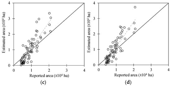 Comparisons of estimated paddy areas derived from Moderate Resolution Imaging Spectroradiometer (MODIS) images and the observed paddy areas from the Korean Statistical Information Service (KOSIS) data in South Korea in (a) 2011, (b) 2012, (c) 2013, and (d) 2014.