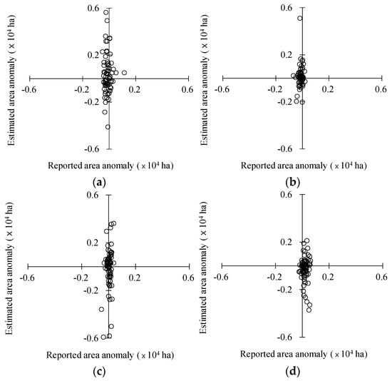 Anomalies in the paddy areas estimated from Moderate Resolution Imaging Spectroradiometer (MODIS) images and observed from the Korean Statistical Information Service (KOSIS) data in South Korea in (a) 2011, (b) 2012, (c) 2013, and (d) 2014.