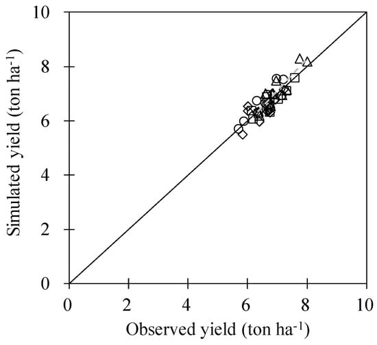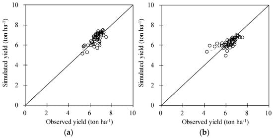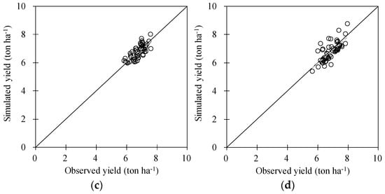 The GRAMI-rice model was calibrated using observed rice yields in 11 counties and was evaluated using those in 62 counties with more than 5000 ha of paddy areas in South Korea (Figure 1). The simulated rice yields were statistically in good agreement with the observed yields in the 11 counties (Figure 10). The RMSE and NSE values were 0.284 ton ha−1 and 0.627 in 2011, 0.324 ton ha−1 and 0.389 in 2012, 0.219 ton ha−1 and 0.733 in 2013, and 0.622 ton ha−1 and 0.692 in 2014, respectively (Table 5). According to the paired t-tests, the observed and simulated rice yields showed no significant differences with p-values of 0.732, 0.628, 0.545, and 0.692 in 2011, 2012, 2013, and 2014, respectively (Table 4).
