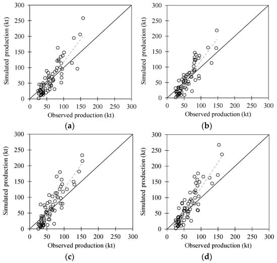 Comparison of observed and simulated rice production in 73 counties of South Korea with more than 5000 ha of the paddy areas in (a) 2011, (b) 2012, (c) 2013, and (d) 2014.