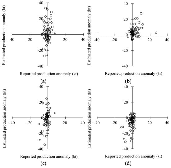 Anomalies in the simulated and observed production in 73 counties of South Korea with more than 5000 ha of the paddy areas in (a) 2011, (b) 2012, (c) 2013, and (d) 2014.