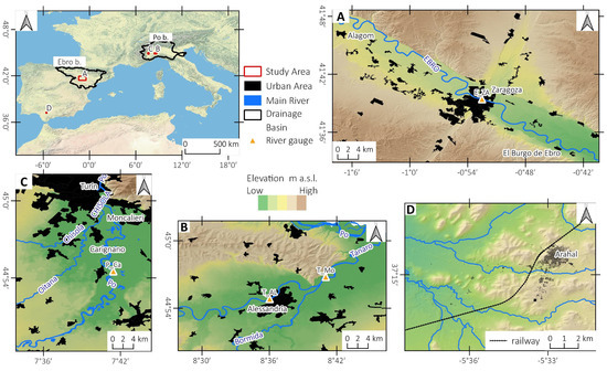 Location of the study areas. Ebro River valley near Zaragoza, Spain, affected by the Ebro River flood in March 2015 (A); Po River basin, Italy, affected by flood in November 2016 with a focus on the plain around Alessandria town (B) and at the plain at south of Turin (C); area around Arahal village, Sevilla, Spain affected by a flash flood in November 2017 (D). The elevation and hillshade are retrieved by using a digital elevation model downloaded from the webGIS service.