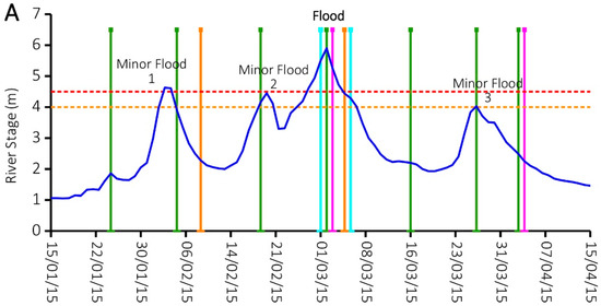 In the case of the Ebro valley and Po basin floods, we used river stage data to select the satellite data most suitable for our analysis. Figure 2 shows the evolution of hydrometric levels during and after the flood events for Po River at Carignano gauge [60] (P_Ca in Figure 1C), Tanaro River at Alessandria gauge [61] (T_AL in Figure 1B) and Ebro River at Zaragoza gauge [53] (E_ZA in Figure 1A) versus the satellite passes.