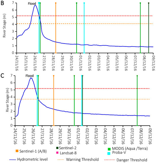 In late November 2016, a severe flood hit the western sector of the Po River basin corresponding to the Piemonte region (NW of Italy). This area, periodically affected by floods, particularly during the autumn and spring seasons [54,55], has already been investigated with remote sensing technologies [28,32,36]. In the period of 21–25 November 2016, heavy rainfall of up to 50% of the mean annual precipitation (e.g., 700 mm of cumulated rainfall at Piaggia station [56]) occurred in the western basin of the Po River and its tributaries, the Tanaro River in particular. The Po River at Caringano gauge (P_Ca in Figure 1C) reached a maximum discharge of approximately 2000 m3/s in the late evening of 25 November 2016. However, the mean discharge of the monitoring station in November is 70 m3/s. The Po River reached a discharge of 9900 m3/s (November average is 680 m3/s) after the confluence with the Tanaro. The Tanaro River grew to an estimated discharge of 3800 m3/s at Montecastello (T_Mo in Figure 1B) station (average discharge of 220 m3/S) [56]). Thus, inundation of cultivated areas, linear infrastructures and some urban areas, such as the town of Moncalieri [57], occurred with estimated damages of 50 M€. In this case, the Copernicus EMS (EMSR-192 [58]) was also activated, allowing the production of automatic flood maps based on using RADARSAT-2 and Pleiades images in the most critical areas. In our work, we used data from MODIS-Aqua, Proba-V, and Sentinel-1/2 satellites with the support of a DEM of the area. In particular, we selected the two areas that were most heavily affected by the flood: (1) The plain located around the Alessandria town (Figure 1B) was inundated by the Bormida River on 25 November 2016 and by the Tanaro on 25–26 November 2016. Here, the main land use is cultivated land with small farms; the town of Alessandria (95,000 inhabitants) was not affected by inundation; (2) The plain located at south of Turin city (Figure 1C) was flooded by the Po River and the other tributaries (i.e., Chisola and Oitana streams) on 25 November 2016. Here, the main land use is cultivated land, some villages and the urban area of Moncalieri (60,000 inhabitants). To validate our results, we used the flooded area maps made available by the Regional Environmental Protection Agency (ARPA is its Italian acronym) of the Piemonte region.