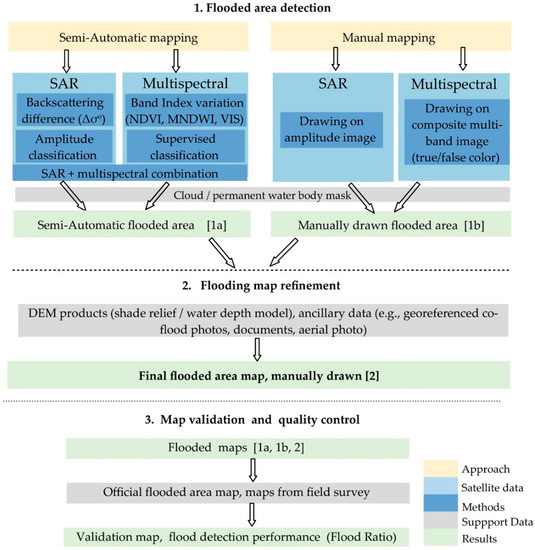- The first step is the detection of the flooded area, which can be performed using a manual or a semi-automatic mapping approach: