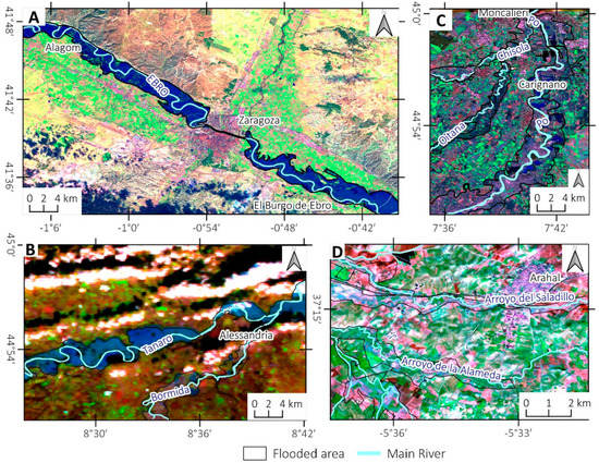 - In the Ebro valley near Zaragoza (Figure 4A), we used a Landsat-8 co-flood image acquired on 2 March 2018; in this case, the false-color image allowed mapping the entire flooded area.