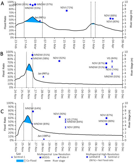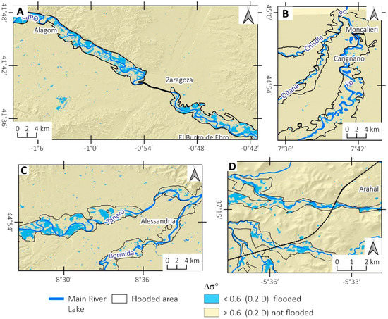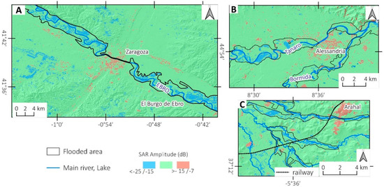 In the case of the Po and Tanaro Rivers, the number of useful images acquired during the co-flood phase (approximately 12 h) is limited, and most of the analysis was performed by using post-flood data. In the case of the Ebro River valley, the long co-flood phase of March 2015 (2–3 days) allowed us to collect more co-flood data.