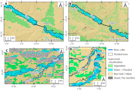 - In the Po River basin, at the South of Turin city (Figure 4B), the Sentinel-2 post-flood image shows only weak traces, and the semi-automatic classifications better identified the inundated area.