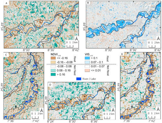 - In the Po River basin, around Alessandria town (Figure 4C), we used the Proba-V image acquired in the morning of 26 November 2016. In this case, it was possible to map most of the area flooded by Tanaro River, but the area flooded by Bormida River was not clearly detectable.