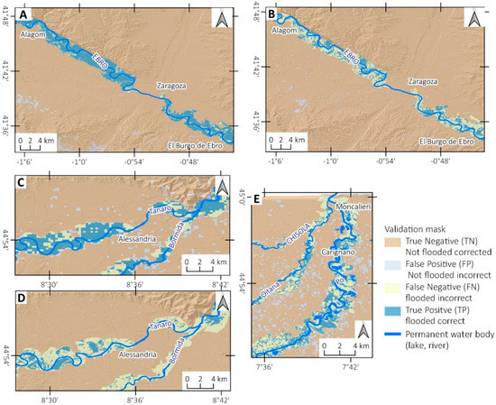 - We evaluated the efficacy of used datasets and methods by computing the flood-mapping ratio (Equation (5)) and the not-flood ratio (Equation (6)) represented as a percentage format.FR (%) = TP/(TP + FN)NFR (%) = TN/(TN + FP)