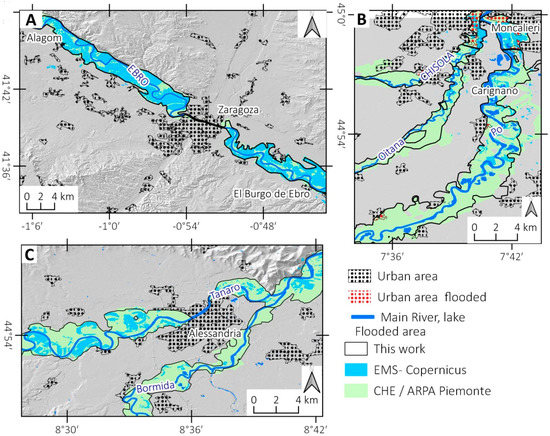 The cases of the Ebro valley and Po basin floods are representative of rivers with a wide floodplain in which the flood peak requires from many hours to several days to transit the river length, and the inundated area can reach several kilometers in width. This type of flood is more prone to be mapped by satellites because of its spatial and temporal scale. In addition, the availability of ancillary or field data is higher for the main river. The case of Arahal is representative of flash-flood processes common in semi-arid and hilly environments that have rapid temporal evolution and limited flood area extent. In this case, mapping with satellite data is less straightforward.