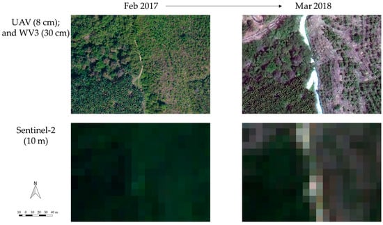 Examples of images of the same location using UAV, WV3, and Sentinel-2 in February 2017 and March 2018 (shown in RGB).