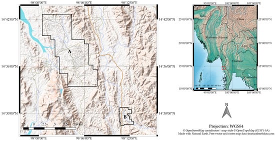 We conducted our analysis in two areas, totaling 13,330 ha, containing oil palm (Elaeis guineensis) plantations in the Dawei district, Tanintharyi region, Myanmar (Figure 3). The Tanintharyi region is in southern Myanmar and west of Thailand, where the development of oil palm plantations started in 1999. Among three districts in the region, Dawei is located to the north, and in general, has older oil palm plantations than those areas to the south. Oil palm companies in this area are believed to be less active, as the dryer climate creates less favourable conditions for oil palm plantations, compared to the other two districts in the south []. However, it has been reported that a conflict between villagers and one oil palm company in Area B resulted in a lawsuit in 2016, indicating that there are some actively managed plantations in the area [].