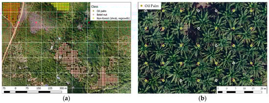 Dot-grid photointerpretation method showing an example of reference data collected for (a) oil palm, betel nut, and shrub (UAV, Area A, 2017); (b) oil palm trees were identified with orange dots if they fell within the circle of palm canopy (UAV, Area B, 2017).