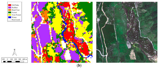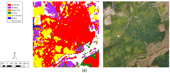 Accuracy rates per class were also consistently high across the classes, with more than 84.7% and 93.5% median accuracy rates for user’s accuracy (UA) and producer’s accuracy (PA), respectively (Table 7 and Table 8). UA is the proportion of the area mapped as a particular class that matches with the testing data, while PA is the proportion of the area that is a particular class in the testing data and is mapped correctly as that class []. Excluding water, the highest average accuracy was 98.4% for rubber (PA), while the lowest average was 84.7% for betel nut (UA).