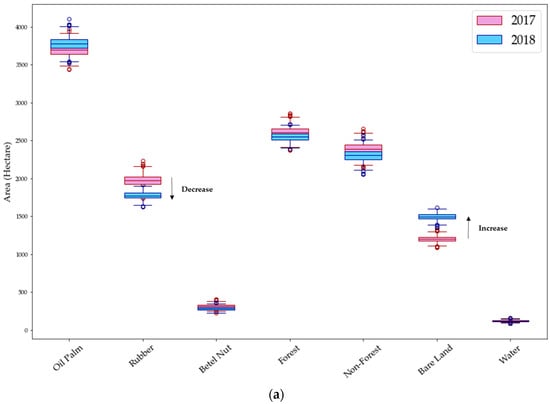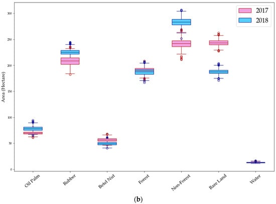 The area changes from 2017 to 2018 were examined by considering the differences between the years, compared to the spread of values from the 1000 iterations. Figure 7 shows boxplots for each area in 2017 and 2018: the median value of the area size (hectare) of each class, the minimum and maximum values, and the 25th and 75th percentiles indicating 50% of the distribution of the data. We considered it likely that there was a significant change if there was no overlap in the interquartile ranges of the two sets of data (represented graphically as no overlap in the box portion of the boxplots in Figure 7). In Area A, the changes were significant for three classes: rubber, betel nut, and bare land. In Area B, most of the classes show differences in area, except for forest and water classes (Figure 7).
