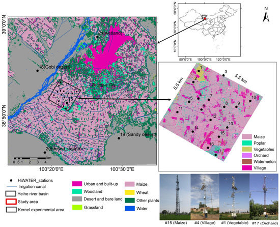The large experimental area contained five stations that had differing underlying surfaces, being the Gobi Desert (station #18), sandy desert (station #19), desert steppe (station #20), wetland (station #21) and maize (station #15). The kernel experimental area contained 16 stations, 13 of which were installed in seed maize plots, and the remaining three of which were installed in a vegetable plot (station #1), a village (station #4), and an orchard plot (station #17). The field observation system of the HiWATER mainly included an automatic weather station (AWS), an eddy covariance (EC), a soil moisture and temperature measurement system with wireless sensor network (WSN). The details of the meteorological and flux sites can be found in Xu et al. (2013) [43].