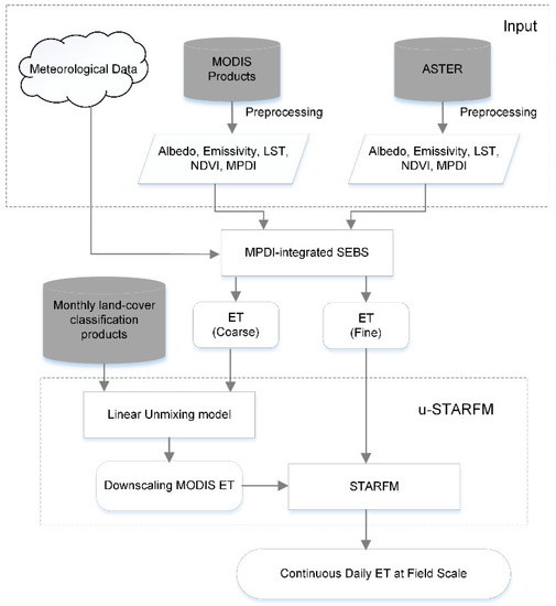 Schematic overview of the inputs and processing steps in the evapotranspiration (ET) data fusion system. (NDVI: normalized difference vegetation index; LST: land surface temperature; MPDI: the modified perpendicular drought index; MODIS: the moderate resolution imaging spectroradiometer; ASTER: the advanced space-borne thermal emission reflectance radiometer; STARFM: spatial and temporal adaptive reflectance fusion model; u-STARFM: the modified STARFM model)