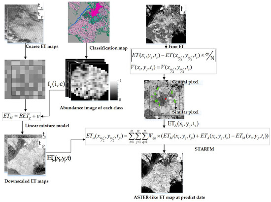 A sketch map of the fusion algorithm is shown in Figure 3. A pair of ASTER–MODIS ET for ts (the basis date) and a MODIS ET for tp (the predicted date) were used as the inputs of the fusion model. Firstly, the land cover components and their abundances were produced from a monthly high-resolution classification map. A downscaled MODIS ET was then retrieved by resolving the linear mixture model combined with the abundance of each land cover based on a least square method. Finally, the downscaled ET maps for ts and tp, along with ASTER ET for ts, were inputted into STARFM to produce the ASTER-like ET on the predicted date.