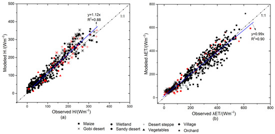A comparison of the modeled and observed surface heat fluxes at the eight experimental sites from 30 May to 12 September, 2012. (a) Shows scatter plots of the modeled and observed sensible heat fluxes (H); and (b) shows scatter plots of the modeled and observed latent heat fluxes (λET). Red and black symbols represent ASTER and MODIS data, respectively.