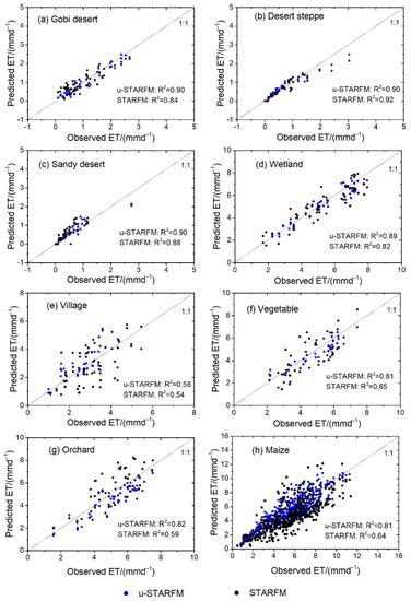 Scatter plots of observed and simulated daily ET, by u-STARFM (blue dots) and STARFM (black dots), for the Gobi Desert (a); desert steppe (b); sandy desert (c); wetland (d); village (e); vegetable (f); orchard (g); and maize (h).