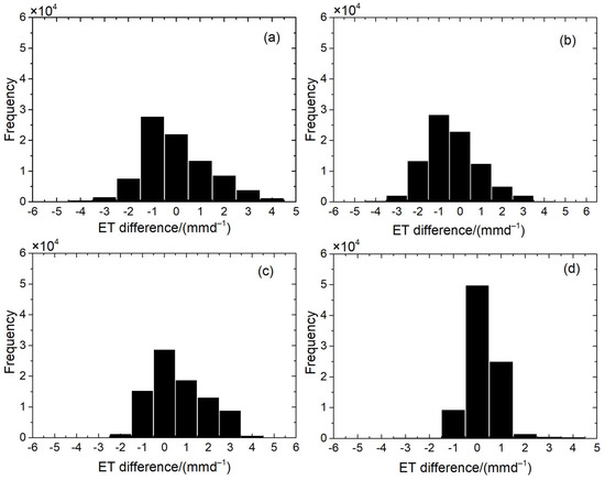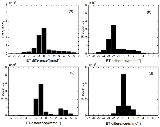 Histograms for: (a) MODIS ET and ASTER ET; (b) unmixing ET; (c) ASTER-like ET based on the STARFM model and ASTER ET; and (d) ASTER-like ET based on the u-STARFM model and ASTER ET, on 15 June.