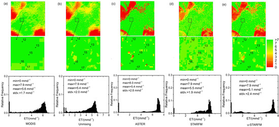 Figure 6 and Figure 8 show the prediction results in comparison with the inputs for: (a) MODIS ET image; (b) unmixed MODIS ET image; (c) ASTER ET image; (d) predicted ET image based on STARFM; and (e) predicted ET image based on u-STARFM, on 15 June and 2 August, respectively. The theoretical basis of the algorithms caused STARFM and u-STARFM to produce ASTER-like ET values, and caused the unmixing-based method to produce MODIS-like ET values. MODIS ET values remained relatively high and had a uniform spatial ET distribution with a high mean value (15 June: 4.2 mm d−1; 2 August: 5.6 mm d−1) and low standard deviation (15 June: 1.4 mm d−1; 2 August: 1.7 mm d−1). However, the unmixed MODIS ET provided relatively more spatial details, and mainly retained the characteristics of the MODIS image (e.g., mean value: 4.2 mm d−1 vs. 3.9 mm d−1; stdv.: 1.4 mm d−1 vs 1.6 mm d−1, on 15 June). The STARFM and u-STARFM algorithms accurately preserved most of the fine spatial detail in the ASTER ET maps (i.e., stdv. for STARFM: 1.8 mm d−1 vs. 2.3 mm d−1; stdv. for u-STARFM: 2.1 mm d−1 vs. 2.3 mm d−1). Compared to STARFM, the prediction of u-STARFM had a closer value to that of ASTER. The frequency of the difference between the predicted ASTER-like LST obtained from the u-STARFM and ASTER ET values distributed in (−1, 1) was highest (Figure 7). Although there was a larger time span for the predicted date of 2 August, the prediction of u-STARFM was also able to describe the detailed ET information (mean: 4.8 mm d−1 vs 4.9 mm d−1; stdv.: 2.4 mm d−1 vs. 2.8 mm d−1) (Figure 8). Most of the difference, on 2 August, between the predicted ASTER-like ET values based on the u-STARFM and the ASTER ET values, ranged from −1 mm d−1 to 1 mm d−1 (Figure 9d). The results of the fused ET indicate that u-STARFM can correctly predict the daily ET values of small objects.
