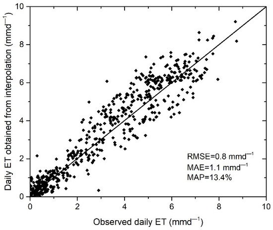 A comparison of the continuous daily ET by interpolation and observed daily ET.