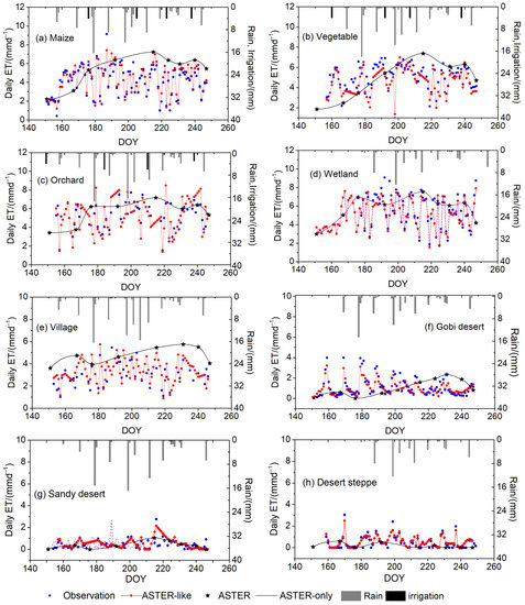 Both the ASTER and synthetic ASTER-like daily ET streams were gap-filled to be continuous using a cubic spline interpolation. All ASTER-like results were compared with the observed ET in Figure 10. The results indicate that a good agreement was obtained between interpolated daily ET and observed daily ET, with RMSE, MAE, and MAP of 0.8 mm d−1, 1.1 mm d−1, and 13.4%, respectively. Figure 11 shows the temporal variation of ASTER-only and ASTER-like results at each of the eight flux tower sites. Clearly, ASTER, with a revisit period of 7–16 days, could hardly capture the temporal variation of daily ET values and was expected to result in large uncertainties. The role played by the MODIS ET in guiding the temporal interpolation of daily ET values between ASTER overpasses was evident from the fused time series. The complete time series of ASTER-like ET estimates generally produced reasonably accurate ET trends for all land-cover types. The day-to-day fluctuations in the ET data stream emphasized the detailed behavior of water stress, crop growth dynamics, and meteorological conditions at the different sites. For the sparsely vegetated sites (i.e., the Gobi Desert, sandy desert, and desert steppe), ET values were less than 1 mm d−1, except for on rainy days. Additionally, the sporadic peaks of daily ET always occurred after rainfall events at these three sites, since the proportion of evaporation from bare soil was high. The fluctuations of daily ET values in vegetated areas covered by maize, vegetables, orchard, wetland, and village were clearly highly complex. Figure 6a–e highlights some significant differences among these sites for different vegetated surfaces, where the individual effects of soil evaporation, soil moisture storage, stomatal regulation, transpiration, and interception storage were all implicitly incorporated into the resulting surface evapotranspiration [52]. The u-STARFM is better able to capture the response of ET to rainfall and irrigation events. Spikes in ET usually occurred after rainfall or on days of irrigation. When precipitation occurred, the daily values of ET at all sites were relatively low, whereas they were relatively high after rainfall (DOY 174, 183, 193, 207). Additionally, peaks in ET values always occurred on days of irrigation (DOY 176, 205, 223, 238).