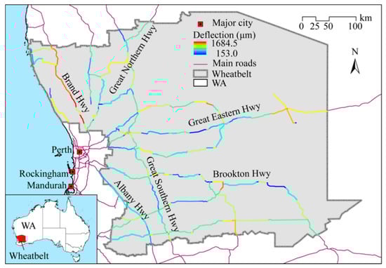 Road conditions are assessed via deflection measurements using a Dynatest 8000 series Falling Weight Deflectometer (FWD) and calibrated with Calibration Method WA 2060.5 by Main Roads, WA [,]. Deflection is a pavement strength indicator measured as the maximum depression in the surface of pavement under a standard load. Figure 1 shows the spatial distributions of mean deflections on road segments. Deflections on the 280 road segments vary across the road network, ranging from 153.0 μm to 1684.5 μm with the average value of 383.6 μm.